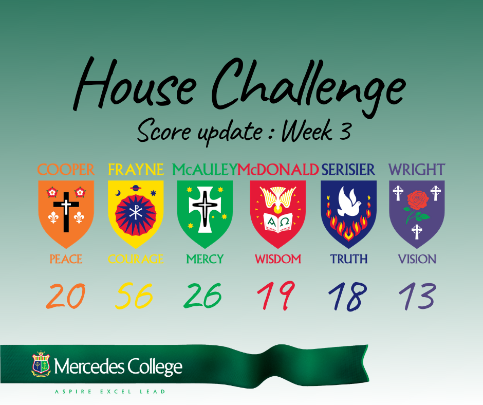 Congratulations to Frayne who has remained on top for 3 consecutive weeks, with a total score of 56 points. Frayne are currently 30 points ahead of McAuley who are in second place. Competitive spirits seem to be rising with only one week to go!