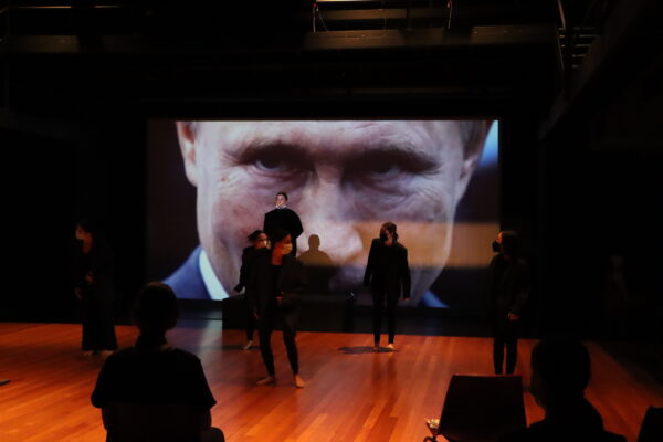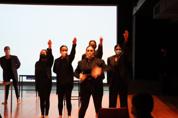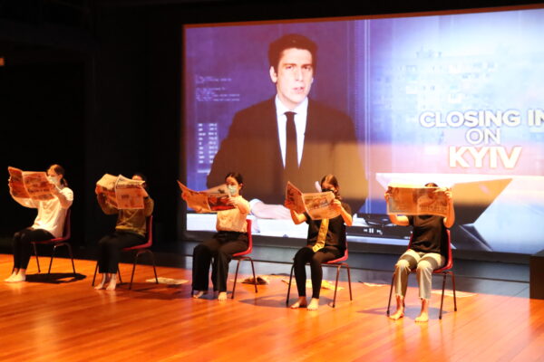 In Year 12, things were a little more experimental. The class has been exploring the physical movement ideas of Anne Bogart and Jacques Lecoq. They then used these ideas to reinterpret their set text Rhinoceros, a play by Eugene Ionesco. Students had to incorporate the absurdist style of the play and ensure the themes the text presents are relevant for a contemporary audience. The play allegorically explores the rise of Nazism in Eastern Europe, and the concepts of individuality, resistance and conformity. These performances saw the students make links to contemporary totalitarian governments and the Russia-Ukraine conflict in their reinterpretations.